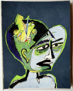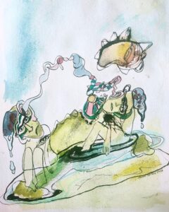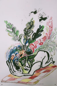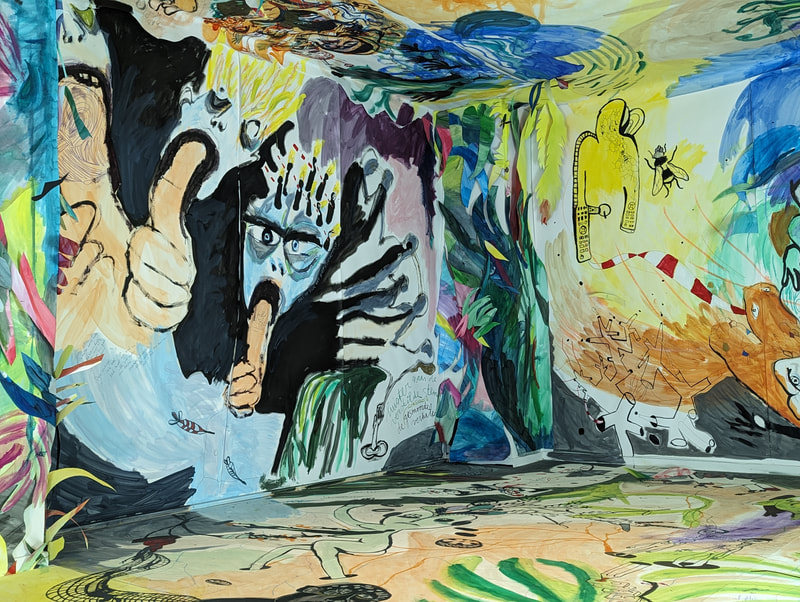 Ik maak installaties waarbij ik een hele ruimte beschilder, andere werken met inkt, waxoliepastel en kleurpotloden.